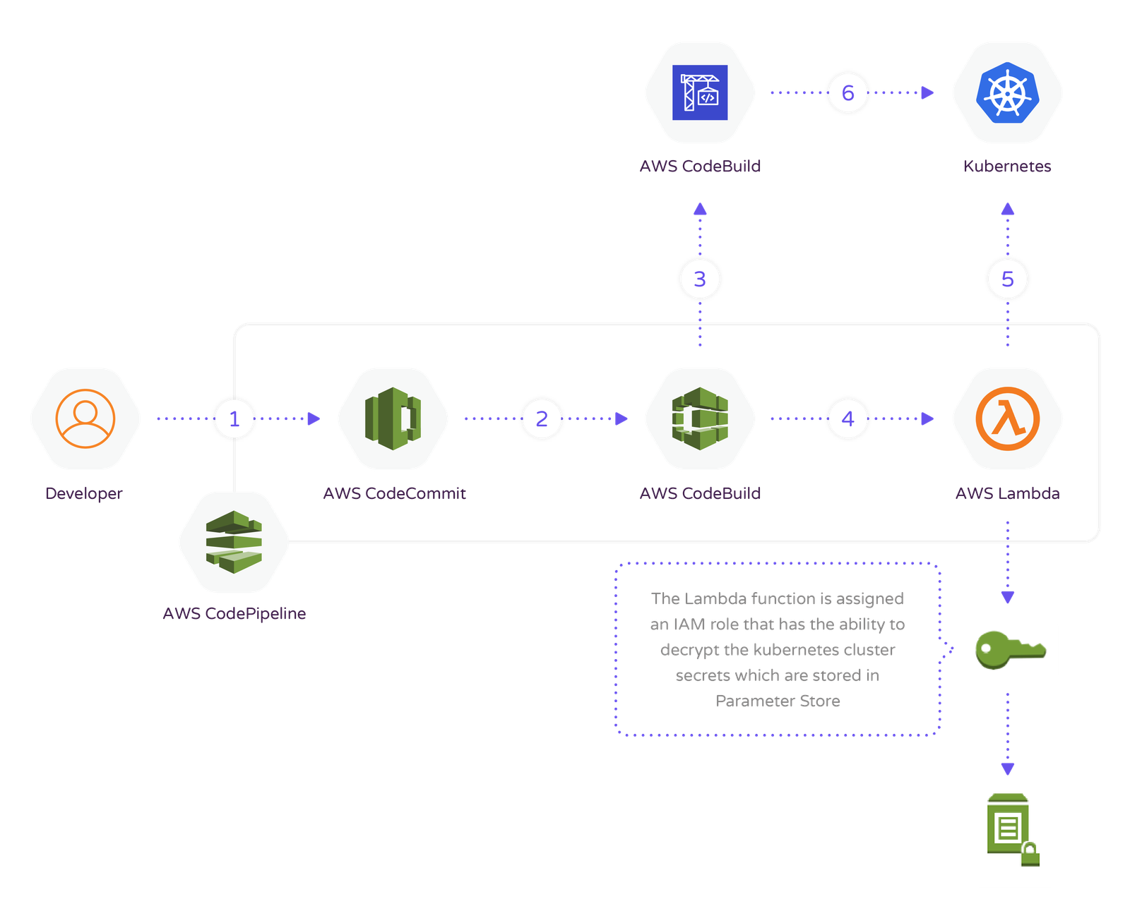 Practicamos la entrega continua mediante AWS CodePipeline, lo que te permite armar un flujo de trabajo que crea código en AWS CodeBuild, ejecuta pruebas automatizadas e implementa código.